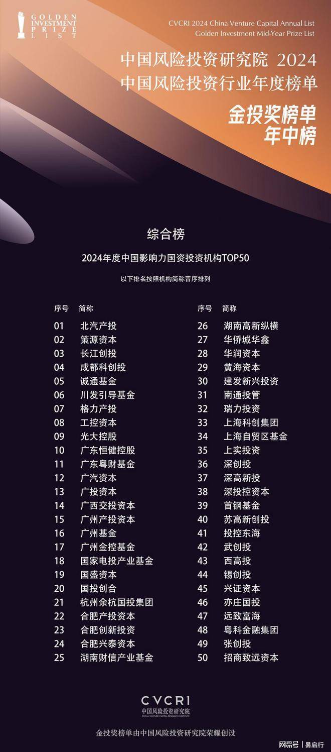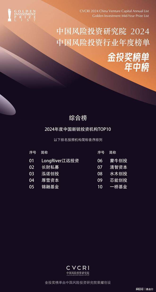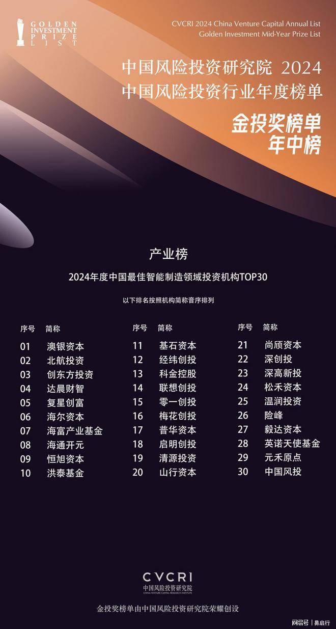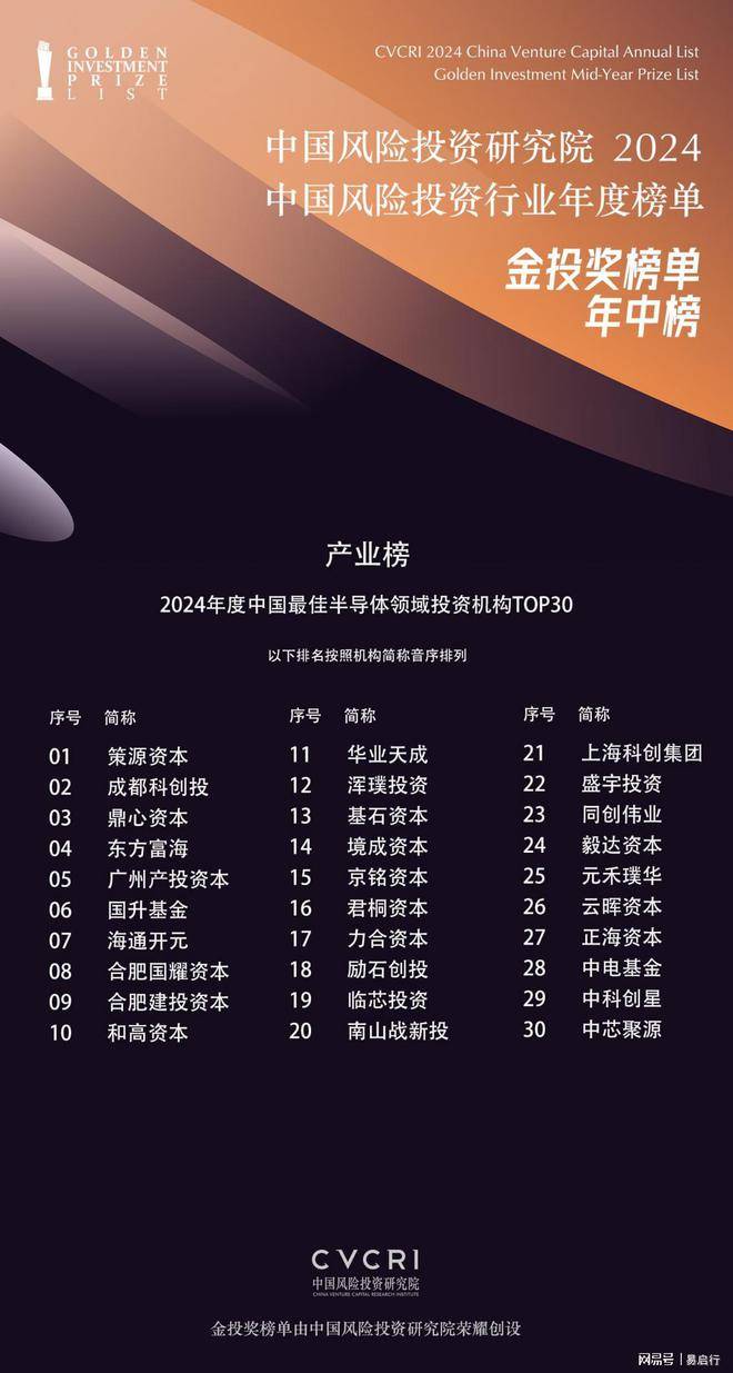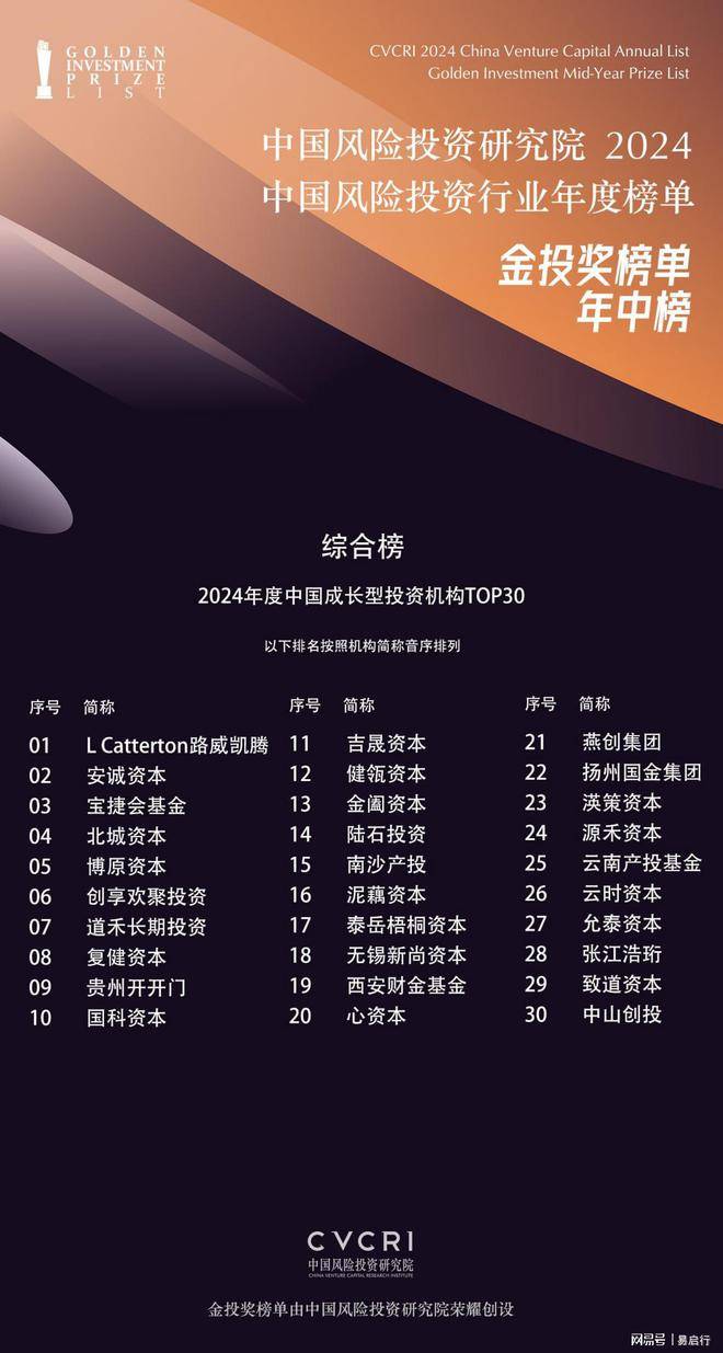 9月26日,中国风险投资研究院·2024中国风险投资行业年度榜单•金投奖榜单•年中榜隆重揭晓,分别评选了综合榜、产业榜两大板块涵盖12个子榜单,从募、投、管、退、综合影响力等维度全方位考量,对在过去一年中国风险投资行业取得优异成绩和卓越贡献、创造社会效益的投资机构进行表彰。